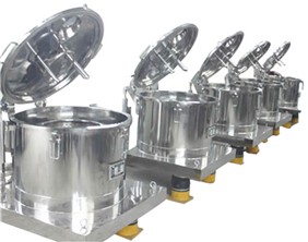 PSB系列離心機(jī)是依據(jù)GMP規(guī)范和環(huán)保要求而設(shè)計(jì)的全封閉立式上部卸料過濾離心機(jī),電機(jī)由變頻控制(也可采用離合器)平穩(wěn)啟動(dòng),通過傳動(dòng)系統(tǒng)帶動(dòng)轉(zhuǎn)鼓使轉(zhuǎn)鼓繞自身軸線高速旋轉(zhuǎn),形成離心力場(chǎng)。加料轉(zhuǎn)速,清洗轉(zhuǎn)速,脫液轉(zhuǎn)速都可以再一定轉(zhuǎn)速(0-額定轉(zhuǎn)速)內(nèi)任意選擇,在離心力場(chǎng)作用下,物料均布在轉(zhuǎn)鼓壁孔上進(jìn)行脫液分離,液相透過固相物料及濾網(wǎng)(袋)的縫隙,經(jīng)轉(zhuǎn)鼓壁孔甩至機(jī)殼空腔,從底盤出液口排出,固相物料則被截留在轉(zhuǎn)鼓內(nèi)。料液由加料管加入,洗滌水通過洗滌管加入,加料,洗滌可由專門的閥進(jìn)行控制,物料脫水,洗滌完畢后停機(jī),借助于特殊設(shè)計(jì)的平衡裝置,打開機(jī)蓋,將物料卸出。